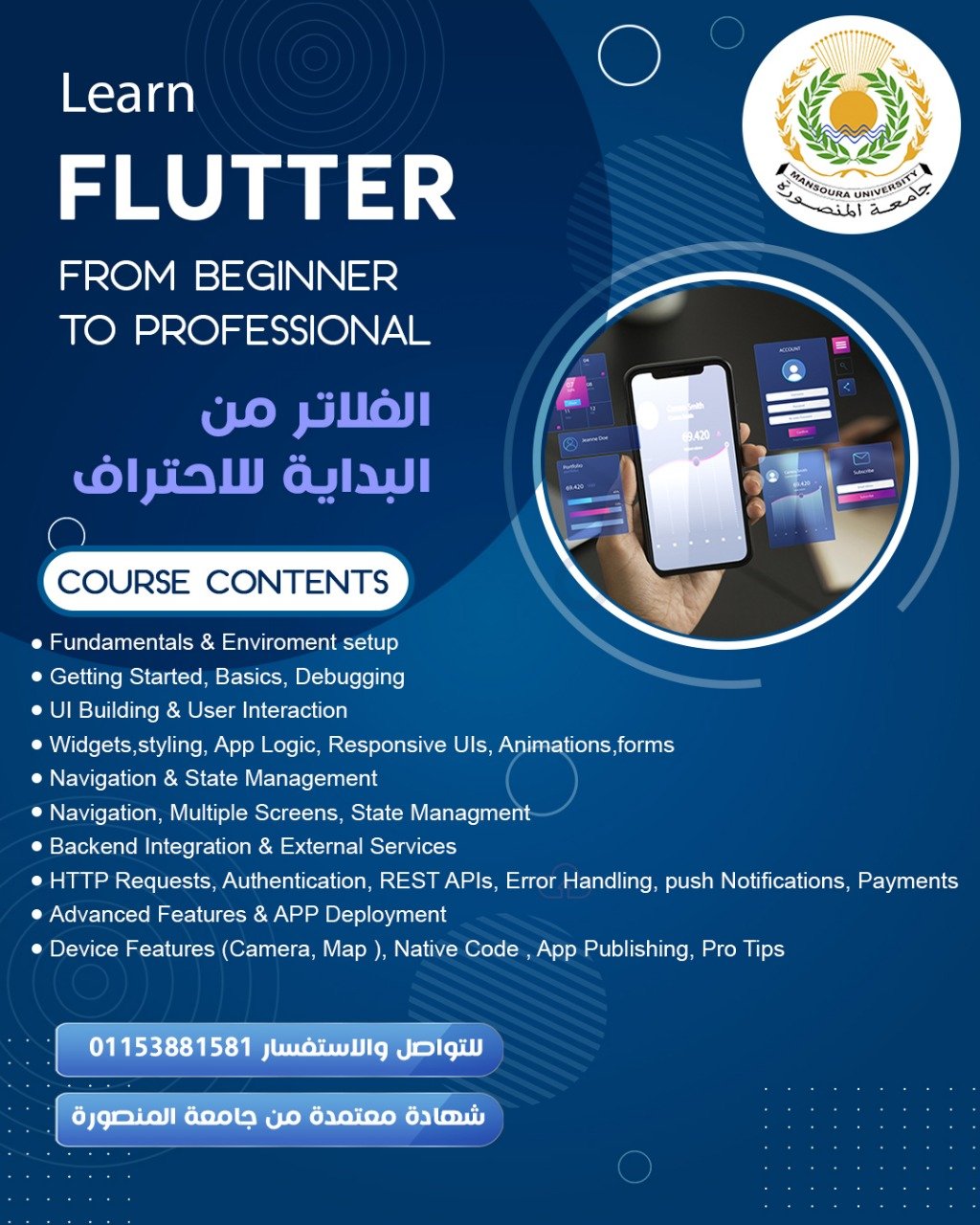 كورس مقدم من أكاديميتنا لمساعدتك على احتراف تطوير تطبيقات الموبايل باستخدام إطار العمل الأقوى من جوجل. ستتعلم خطوة بخطوة كيفية بناء تطبيقات حقيقية تعمل على نظامي Android وiOS بقاعدة كود واحدة، مع التركيز على الجانب العملي والمشاريع التطبيقية.