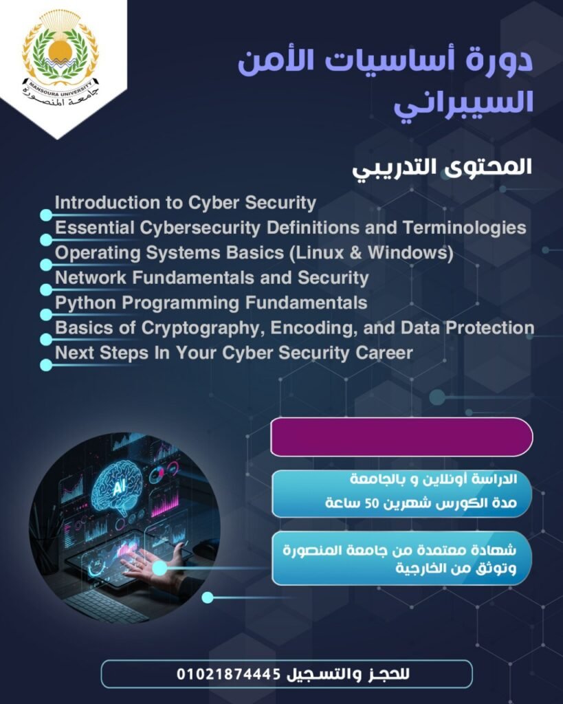 دورة الأمن السيبراني مصممة لتعريفك بأساسيات حماية الأنظمة والشبكات والمعلومات من الهجمات الرقمية. ستتعلم التهديدات الشائعة، طرق الحماية، وكيفية التعامل مع الحوادث الأمنية، مع التركيز على التطبيق العملي والمفاهيم الأساسية اللازمة لدخول هذا المجال المتنامي.