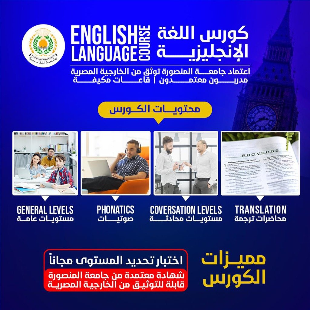كورس اللغة الإنجليزية مصمم خصيصًا لمساعدتك على إتقان مهارات اللغة الأساسية والمتقدمة سواء لأغراض الدراسة، العمل، أو السفر. الكورس يركز على التطبيق العملي والممارسة اليومية من خلال تدريبات محادثة، أنشطة جماعية، وتمارين كتابية واستماع